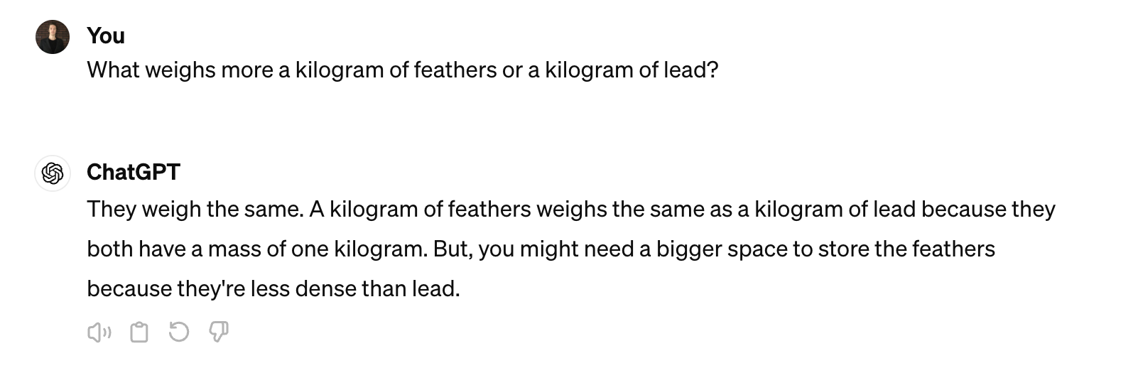 What weighs more a kilogram of feathers or a kilogram of lead?