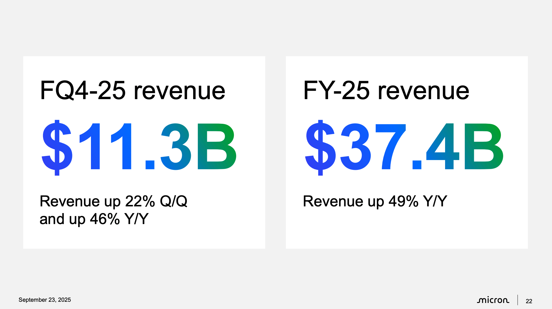 Micron Technology delivered fiscal Q4 2025 revenue, gross margin, and EPS all above the high end of its updated guidance. Q4 non-GAAP diluted EPS reached $3.03, up 59% sequentially and 157% year-over-year, driven by strong pricing and robust performance across end markets including record revenues in the Cloud Memory Business Unit. Fiscal year revenue grew nearly 50% to a record $37.4 billion, with gross margins expanding by 17 percentage points to 41%.