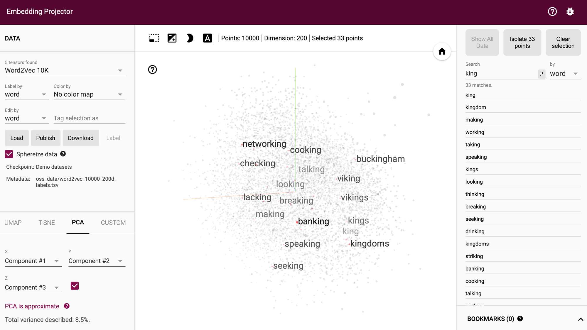 The TensorBoard Projector is a great tool for interpreting and visualzing embedding. The dashboard allows users to search for specific terms, and highlights words that are adjacent to each other in the embedding (low-dimensional) space.