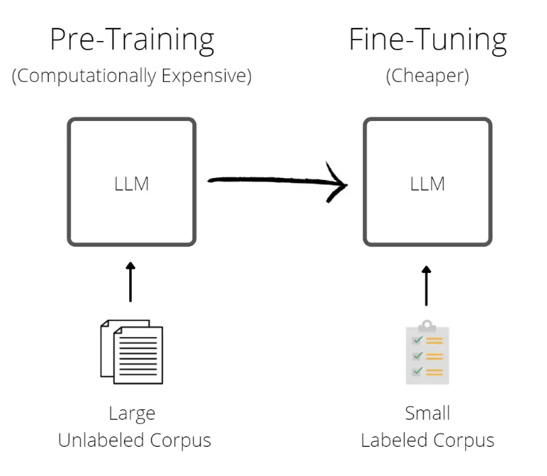 - Fine tuning: After pre-training, the model is then typically fine tuned on a smaller, task-specific dataset. This step involves adjusting the models weights to perform well on specific tasks, such as answering questions, classification, and so on. This step adapts its learned representations during pre-training to perform well on specific tasks, without starting the training prcess from scratch.