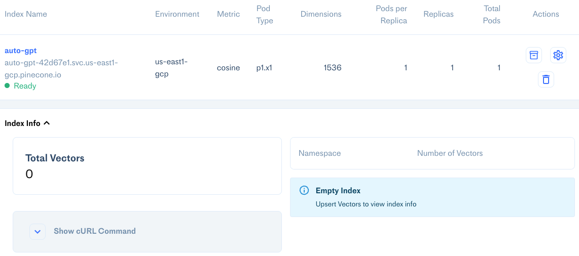 Now, when we run AutoGPT with python -m autogpt we can see this new empty index is setup in our Pinecone console: