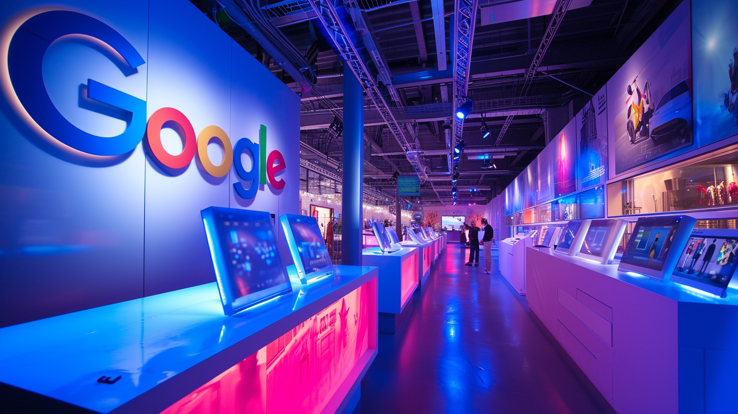 A high-tech exhibition scene showcasing a 3D hologram of the Google logo, surrounded by interactive displays. Electrifying color contrasts, dynamic spatial arrangement, highlighted with LED strip lighting --ar 16:9 --v 6.0