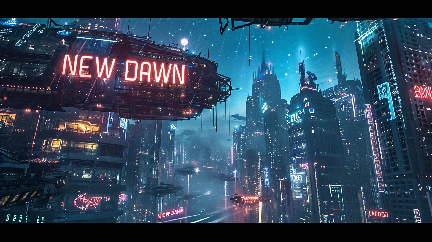 A sci-fi movie poster with the neon-lit words "NEW DAWN", depicting a futuristic cityscape under a starry sky --ar 16:9 --v 6.0