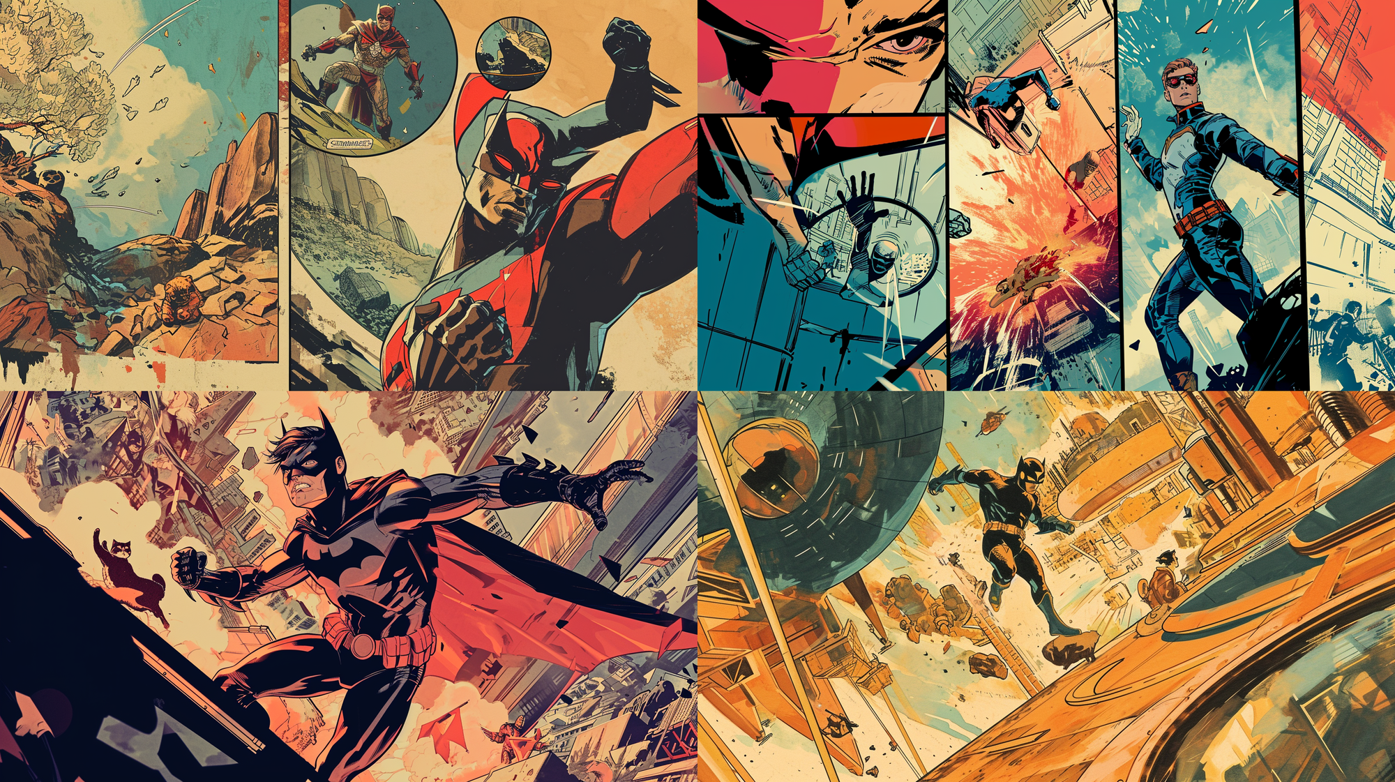 Collage-style comic: 1) Superhero battling a robot in a splash page. 2) Saving a cat in a small circular inset. 3) Waving to fans in a narrow vertical panel --ar 16:9 --v 6.0