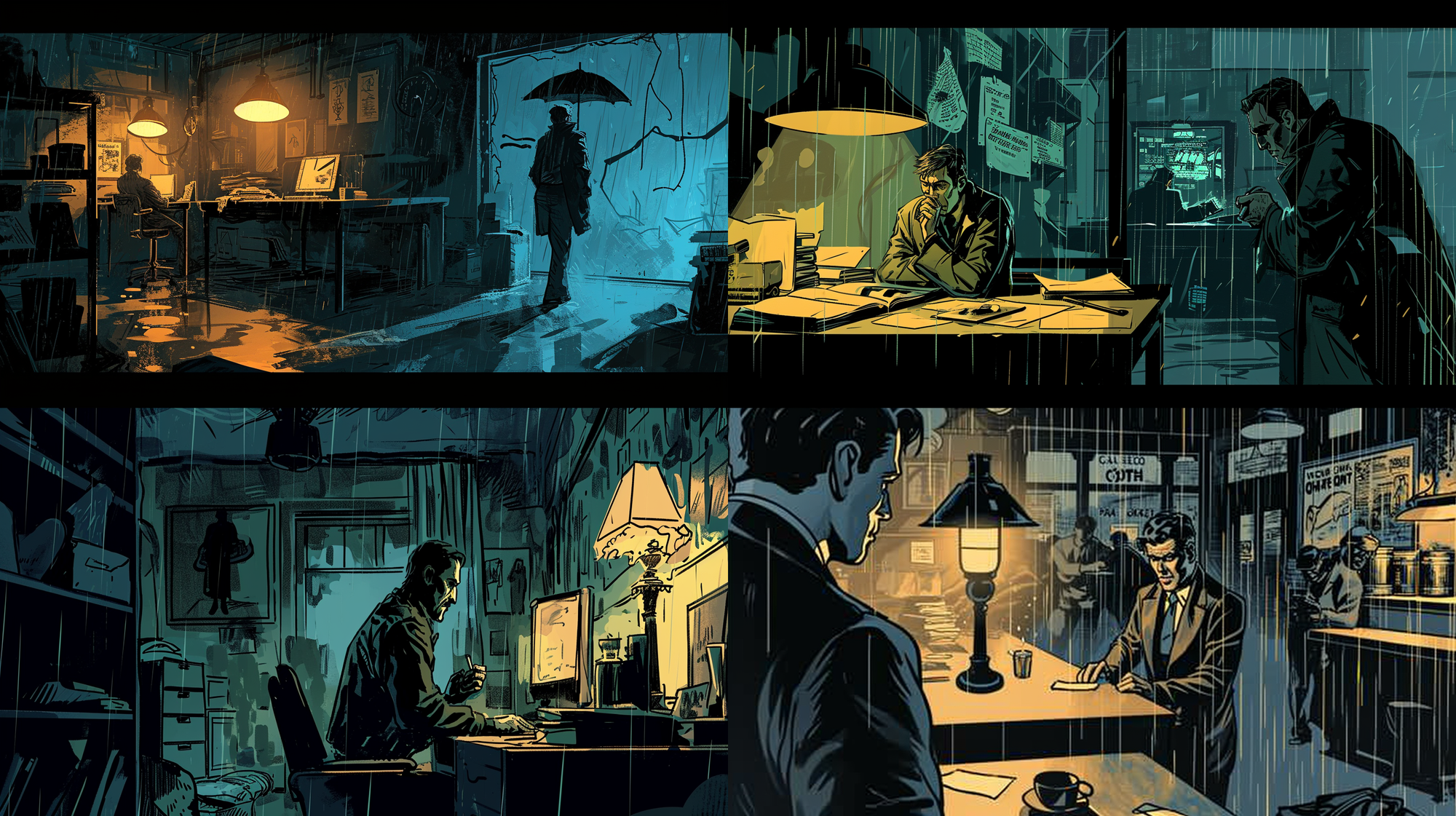 Comic page: 1) Detective examining clues in a dimly lit office. 2) Chasing a suspect through rain-soaked streets. 3) Unveiling the culprit in a dramatic reveal --ar 16:9 --v 6.0