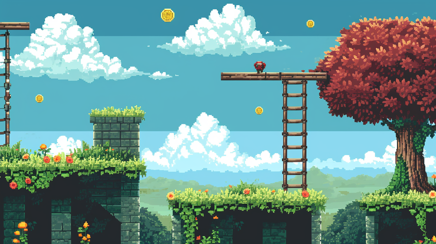 Create an image in the style of a 1980s platform game, featuring a side-scrolling landscape with pixelated art, vibrant colors, and classic platforming elements like ladders, coins, and enemies. --ar 16:9 --v 6.0