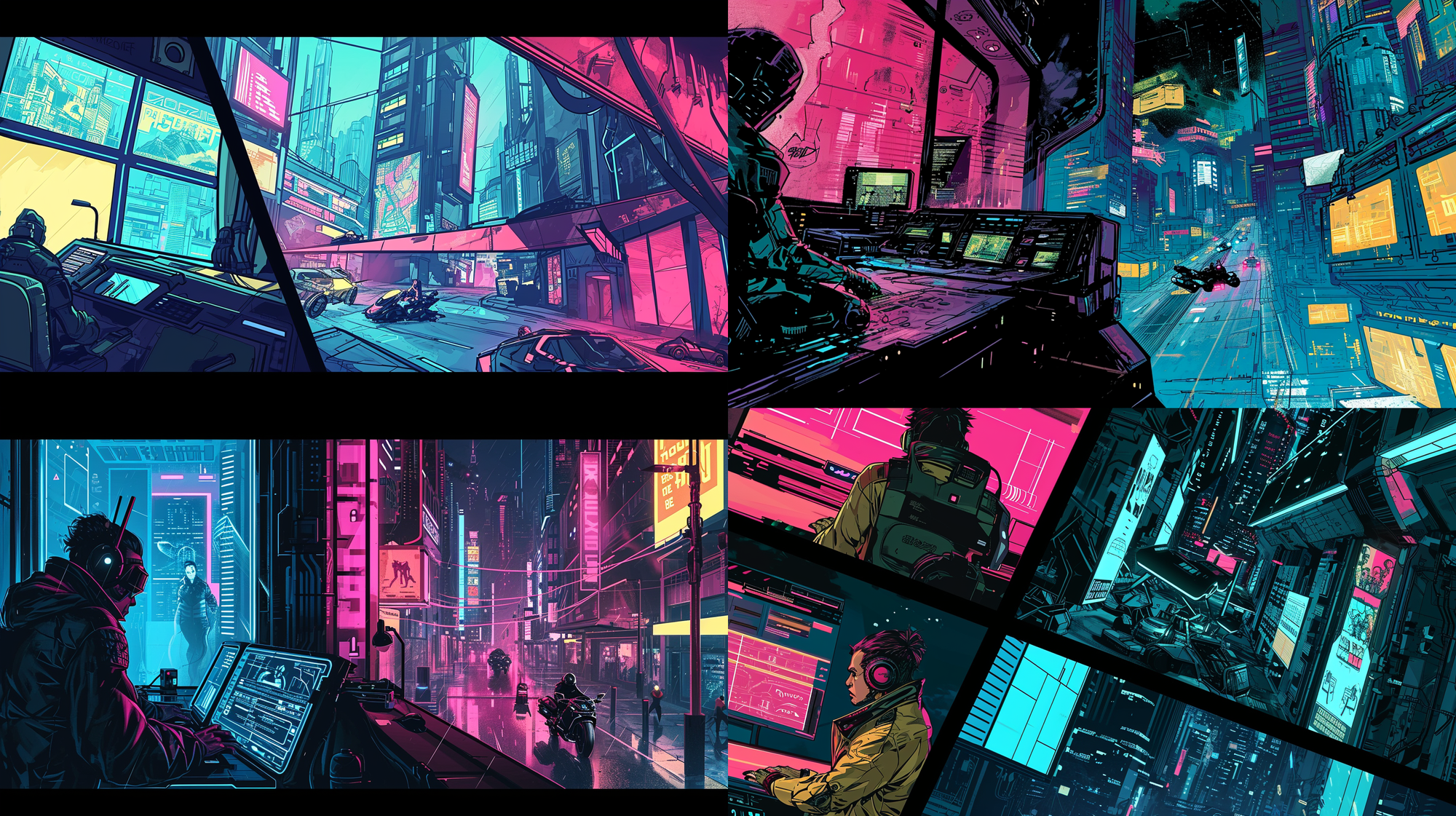 Cyberpunk comic page with a layered panel design: 1) Neon cityscape in a background layer. 2) Hacker at a console in a series of overlapping square panels. 3) Chase on hoverbikes in a jagged, diagonal panel --ar 16:9 --v 6.0