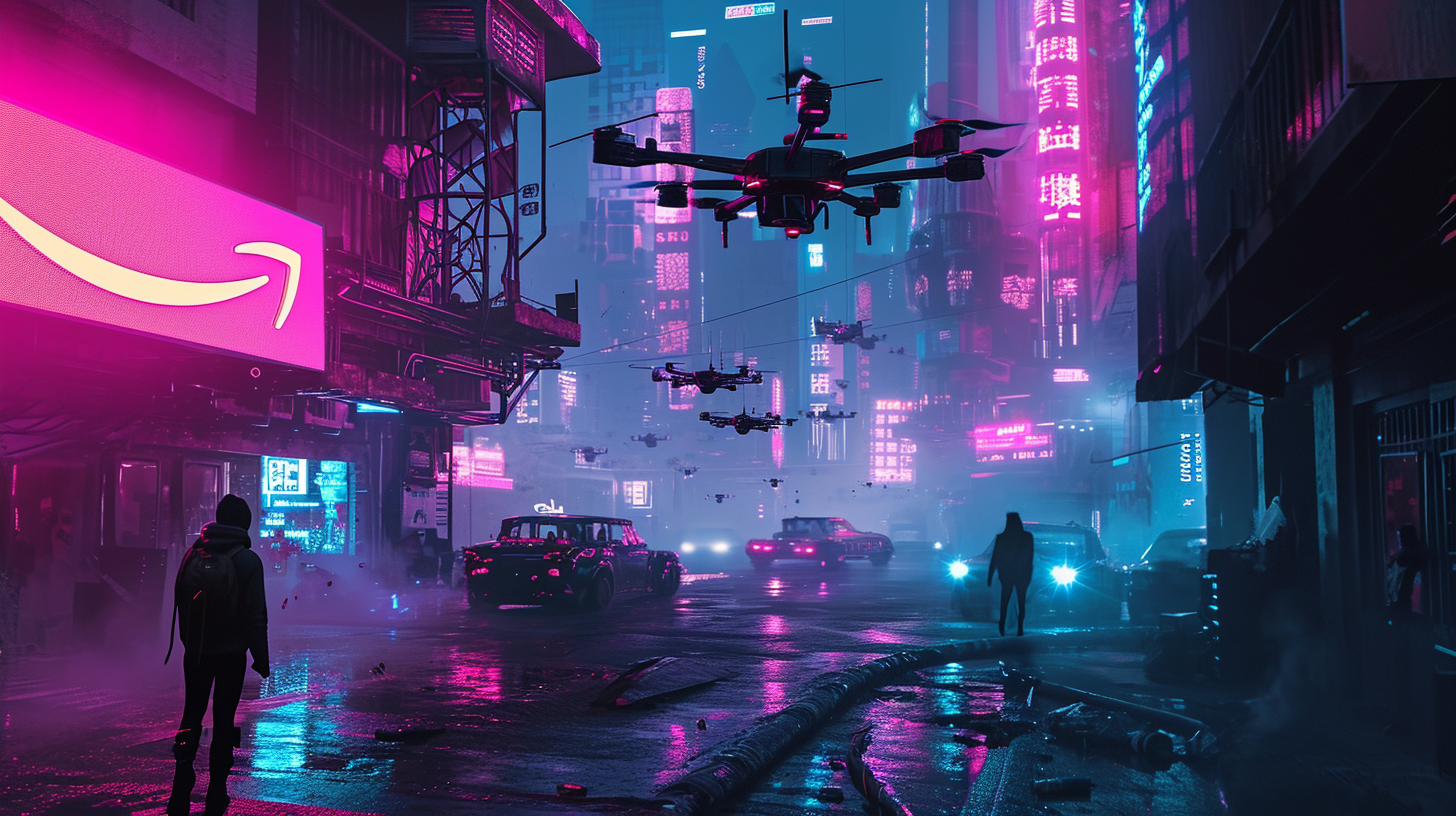 Futuristic scene with drones flying around a neon-lit city, centered around a prominent Amazon logo --ar 16:9 --v 6.0