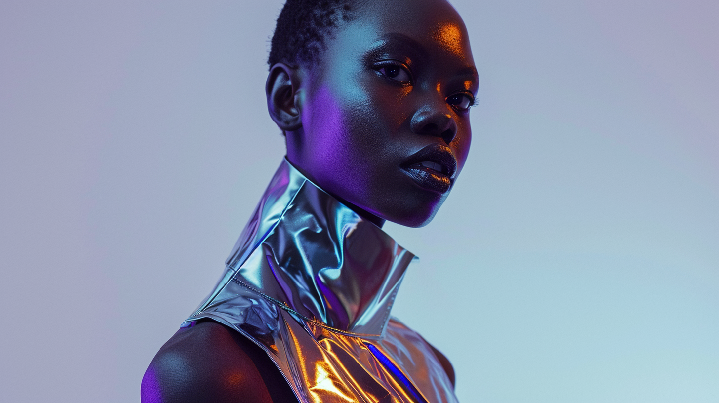 Futuristic fashion with a retro twist, metallic and holographic materials, model sporting a high collar, silver dress, offset by a minimalist, stark white setting, soft diffused lighting --ar 16:9 --v 6.0