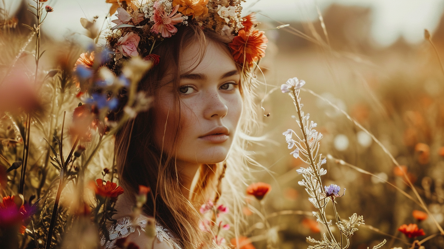 Outdoor shoot highlighting bohemian style, a harmony of earthy tones, model adorned with floral headpiece, layers of textured fabrics, sun-kissed skin, amidst a wildflower field --ar 16:9 --v 6.0