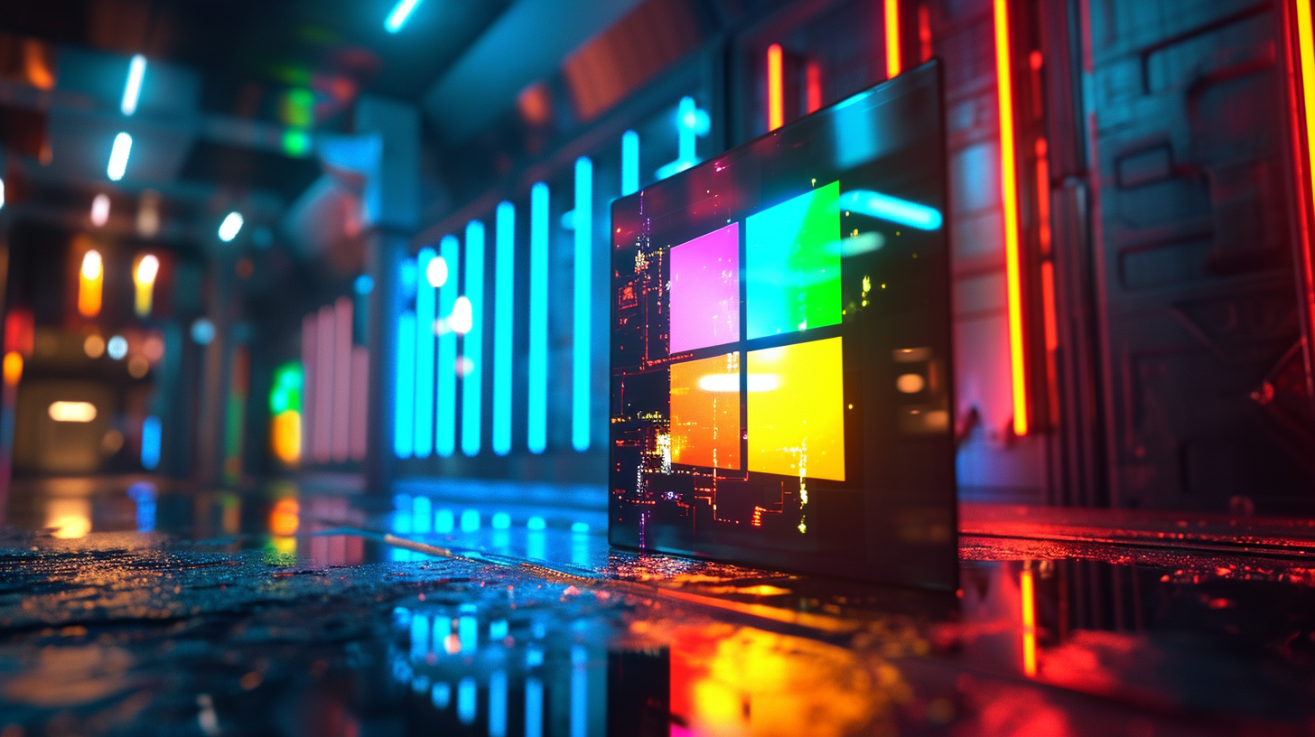 Sci-fi themed portrait featuring a holographic projection of the Microsoft logo bathed in neon lights. Vivid and striking color palette, dynamic angles, illuminated by futuristic lighting. --ar 16:9 --v 6.0