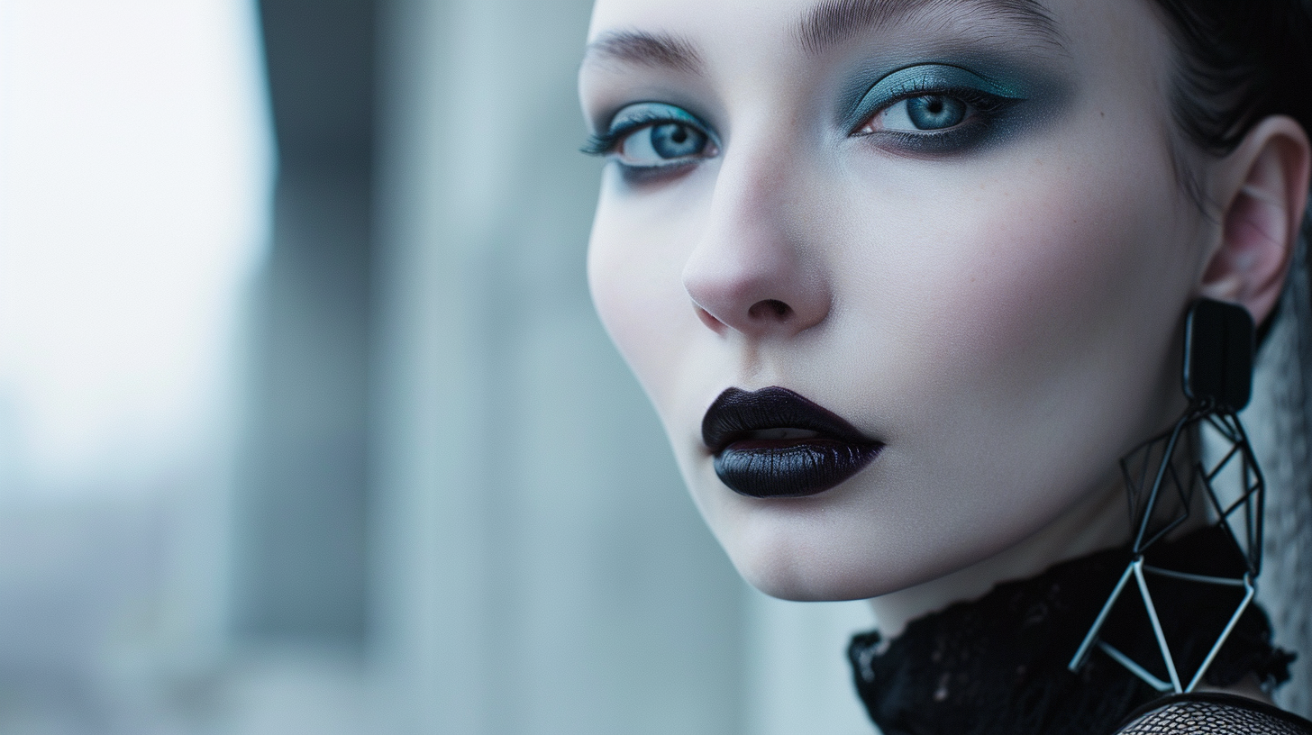 Studio portrait capturing avant-garde fashion, bold monochrome palette, high contrast between model's icy blue gaze and jet-black attire, glossy black lips, geometric accessories --ar 16:9 --v 6.0