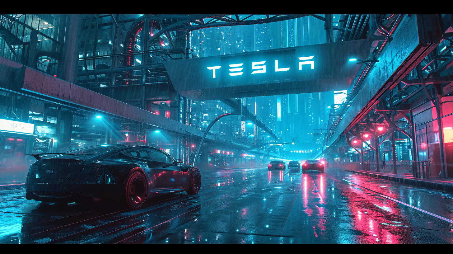 Tesla logo holographically displayed in a futuristic scene, surrounded by sleek cars, all set against a vibrant, neon-lit cityscape --ar 16:9 --v 6.0