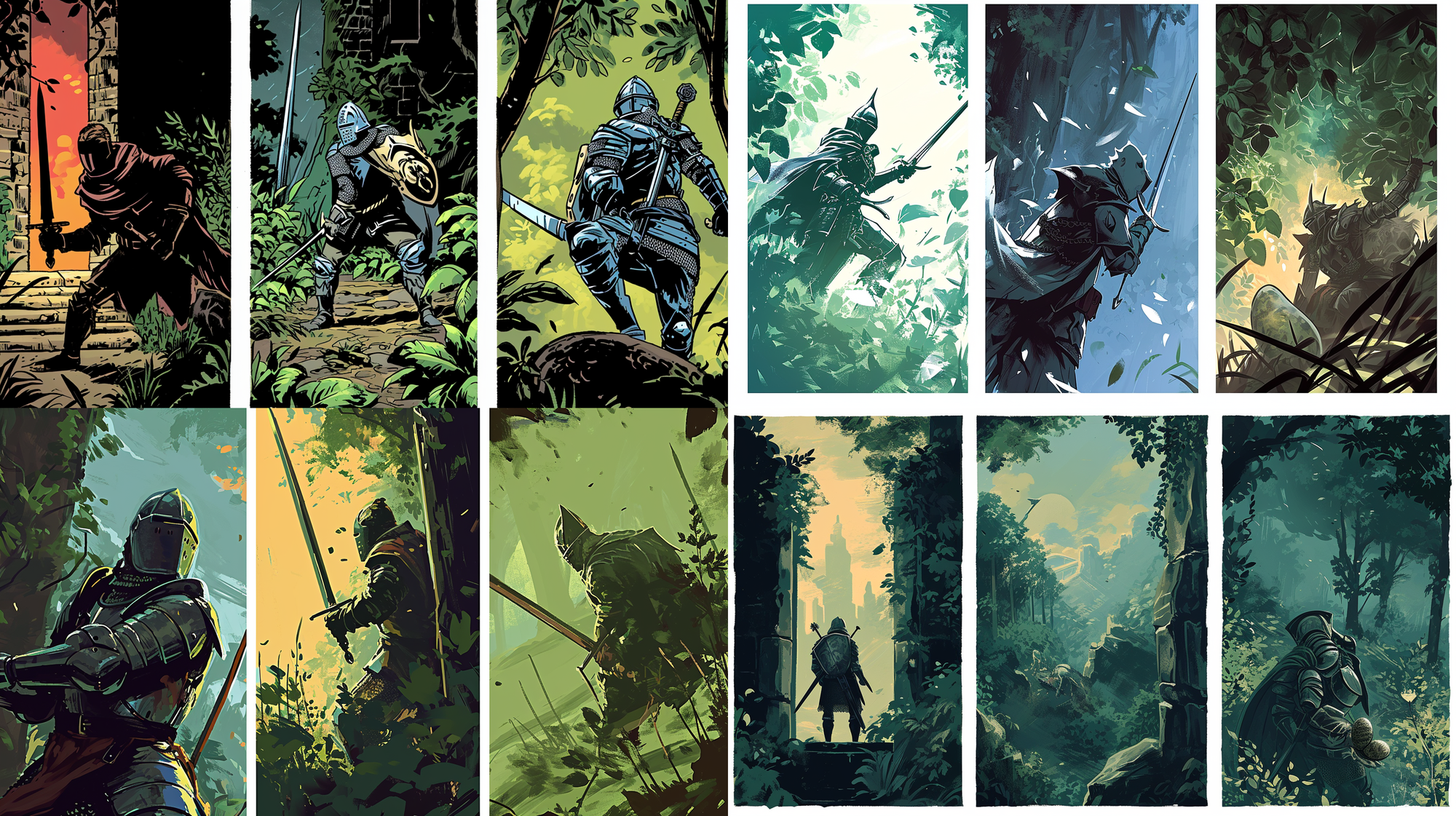 Three-panel comic story: 1) A stoic knight practicing swings in the quiet of the courtyard. 2) An intense moment as swords meet, surrounded by a blur of green foliage. 3) The knight's proud return under a twilight sky, a dragon egg nestled safely in his arms --ar 16:9 --v 6.0