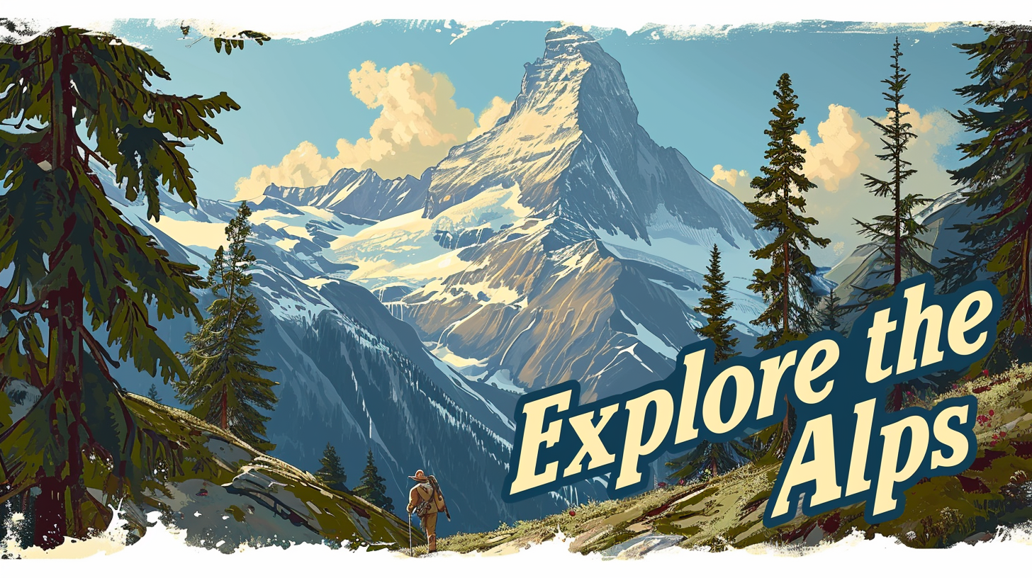 Vintage travel poster with the phrase "Explore the Alps" in elegant script, showcasing a serene mountain landscape --ar 16:9 --v 6.0