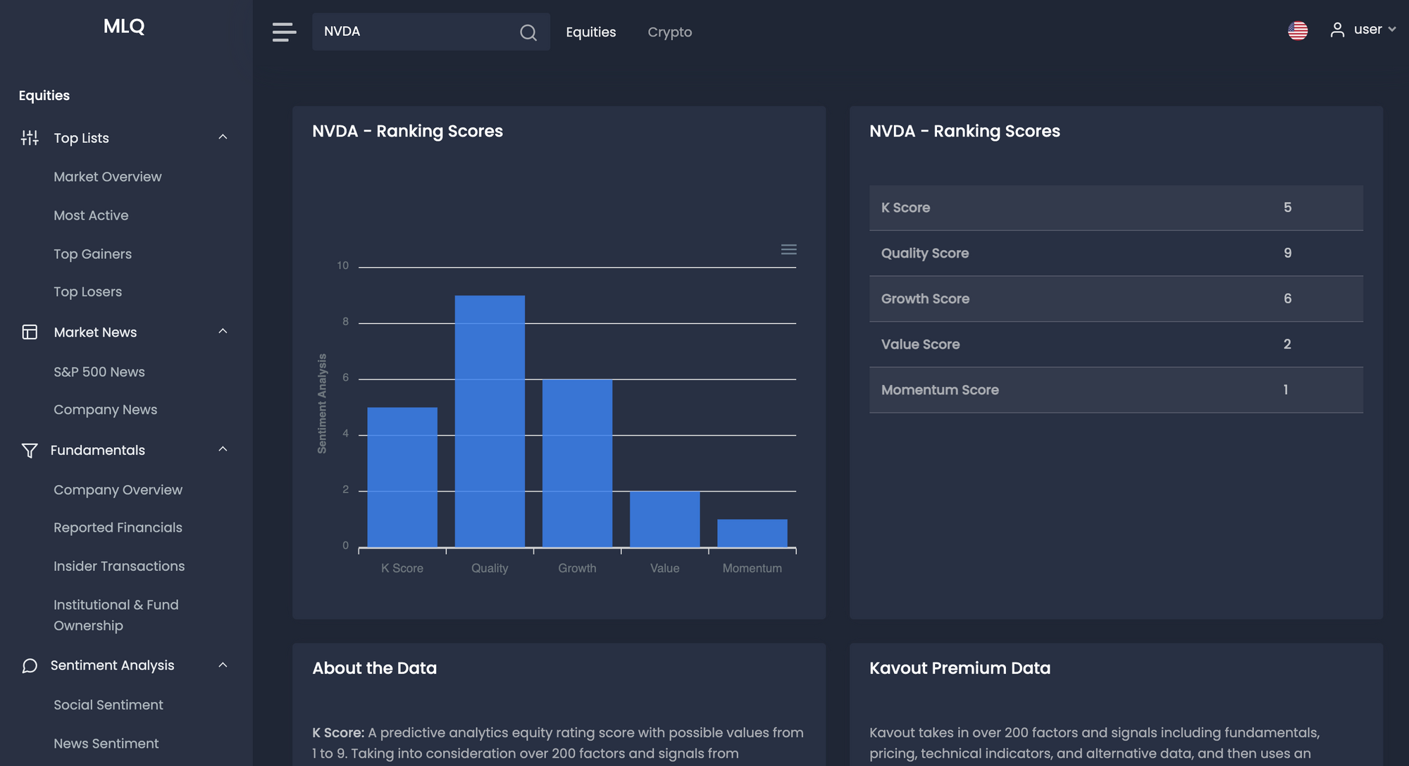 - K Score of 5: This is a ranking score between 0 and 9 with a high score indicating a higher probability of outperformance over the next month.