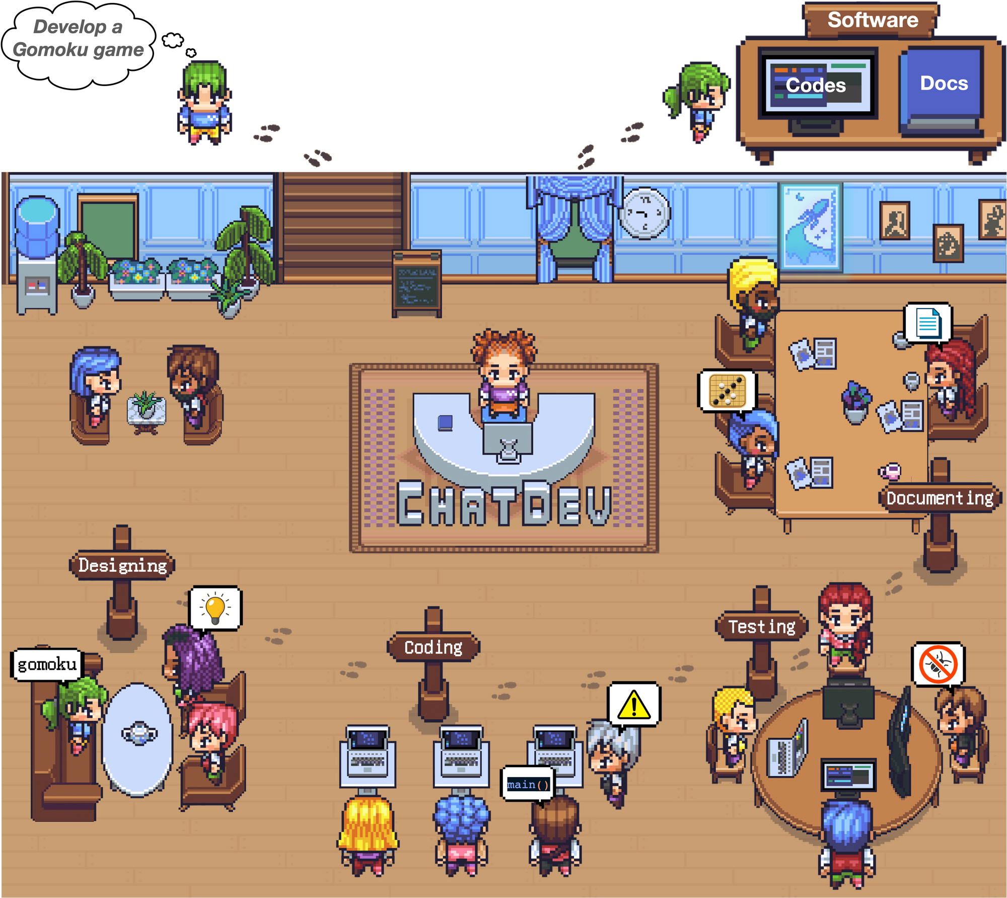 ChatDev’s agents form a multi-agent organizational structure and are united by a mission to “revolutionize the digital world through programming.” The agents within ChatDev collaborate by participating in specialized functional seminars, including tasks such as designing, coding, testing, and documenting.