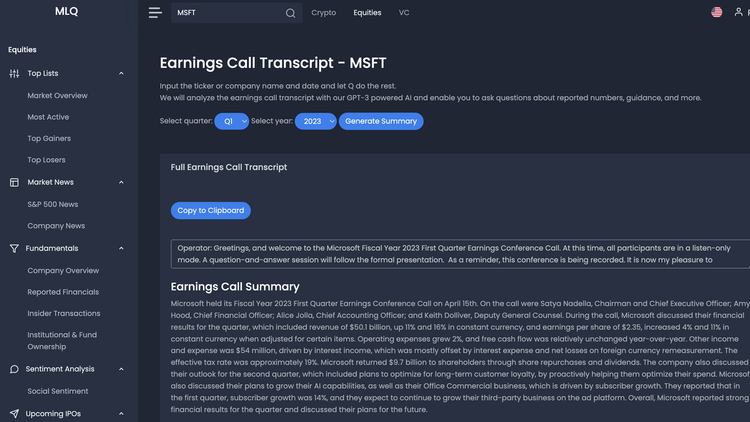 This is an example response of our MLQ Earnings project, where we built a GPT-enabled earnings call assistant on NVIDIA's (NVDA) Q4 2022 earnings call transcript.
