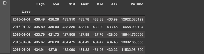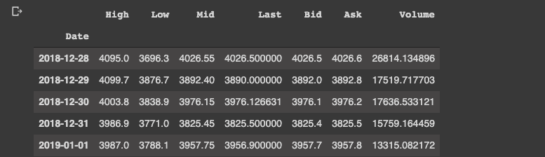 After importing the data we see this dataset has 8 columns and 964 entries. The dataset is daily time series data with the following features: Date, High, Low, Mid, Last, Bid, Ask, Volume.