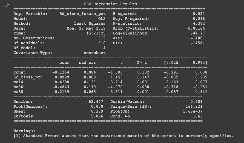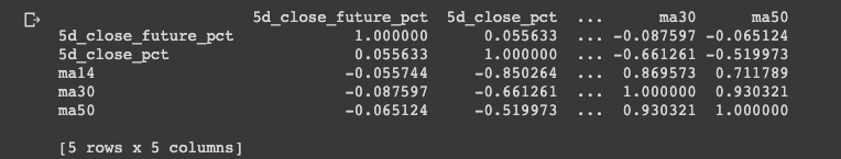 print(feature_names) ['5d_close_pct', 'ma14', 'ma30', 'ma50']