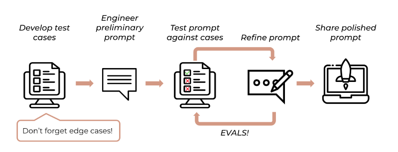 - Refine prompts: Based on the test results, we can then reifine our input prompts to improve the performance, and continue this iterative improvement until we reach a desired level of performance.