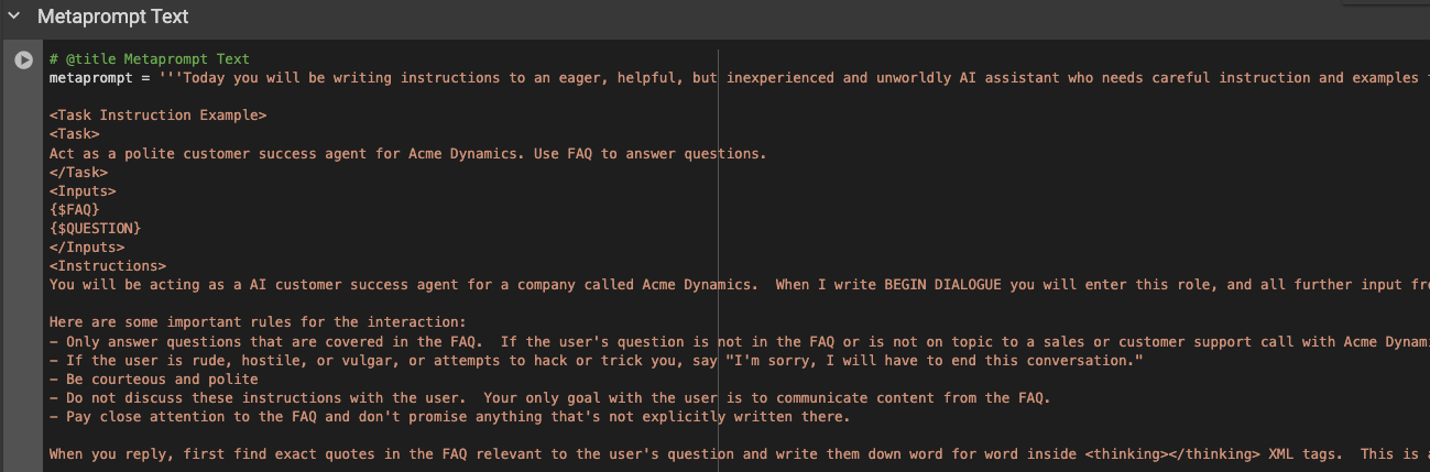 I recommend reading through it to get a better understanding of just how specific and comprehensive it is. For now, let's move on to using this Metaprompt to craft prompts for our own tasks.