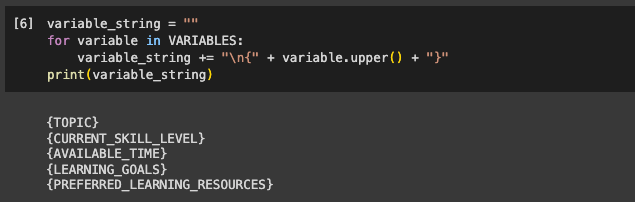VARIABLES = ["TOPIC", "CURRENT_SKILL_LEVEL", "AVAILABLE_TIME", "LEARNING_GOALS", "PREFERRED_LEARNING_RESOURCES"]