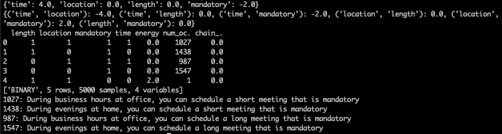 print('{}: During {} at {}, you can schedule a {} meeting this is {}'.format(occurences, time, location, length, mandatory))Now we have converted the minimum energy value in a way that is human-readable, and then we need to print the output generated from the analysis.