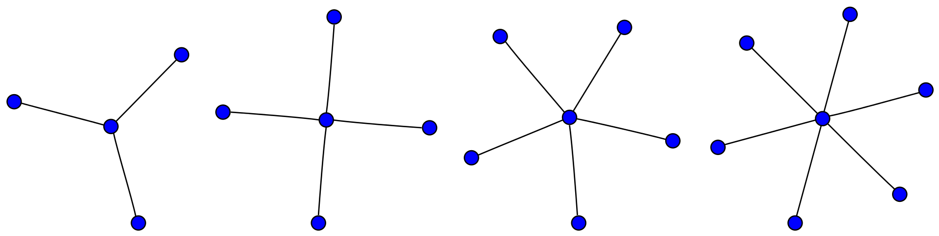 In the image below we can see an example of a star graph with 3, 4, 5, and 6 nodes: