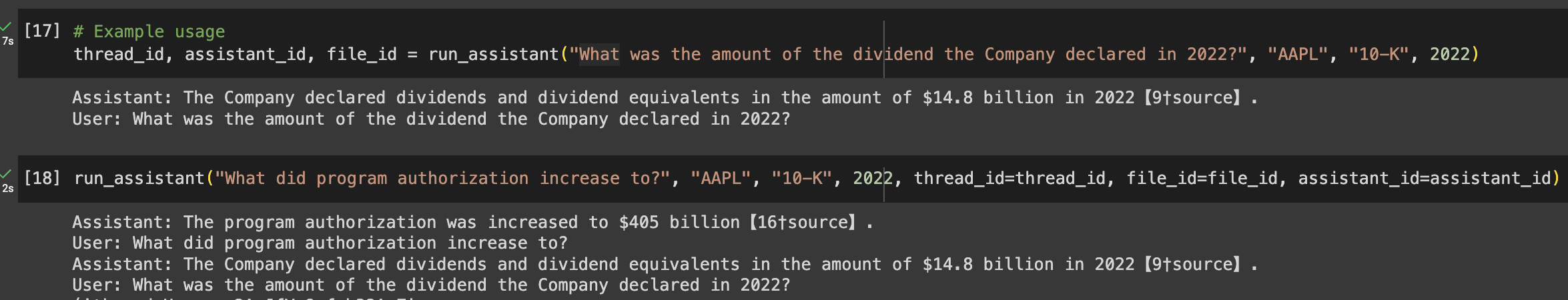 Next, let's go and test the SEC assistant by calling the run_assistant function and passing in the following parameters: