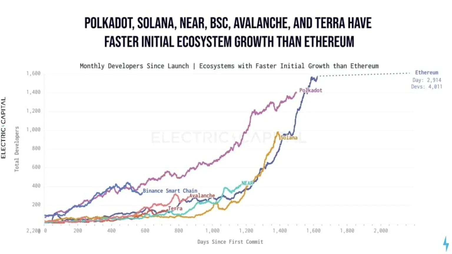 The other key insights from this report is that developer activity on Polkdadot, Solana, Near, BSC, Avalanche, and Terra have seen faster initial ecosystem growth than Ethereum: