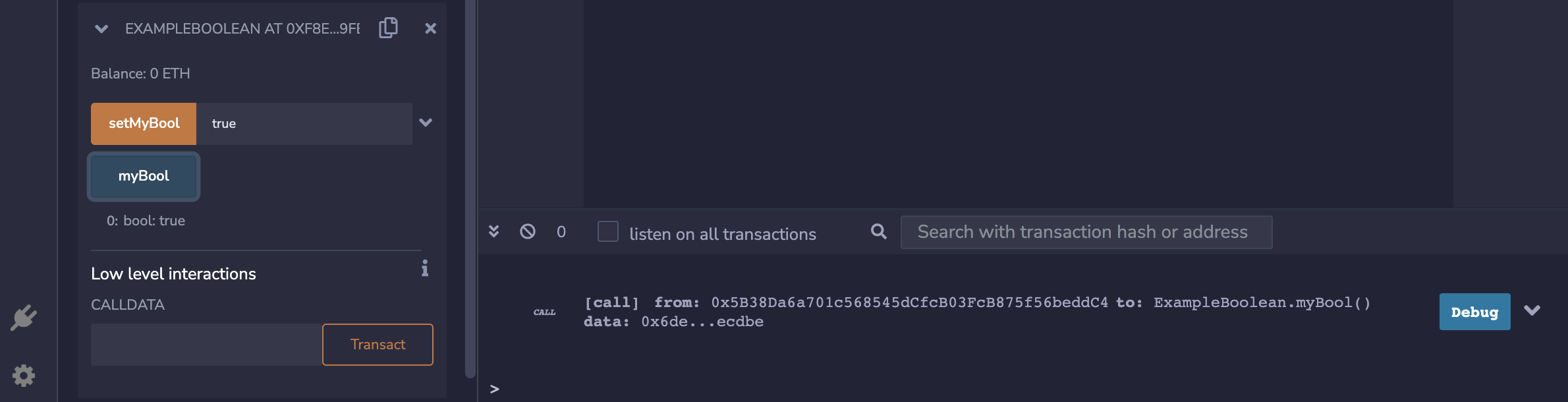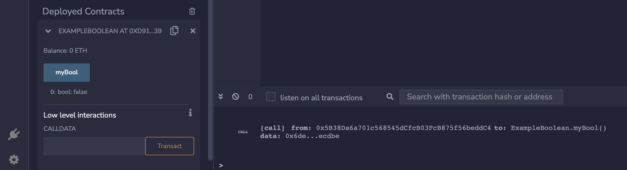 If we make this public and compile and deploy it, we see we have a button called myBool, which returns false: