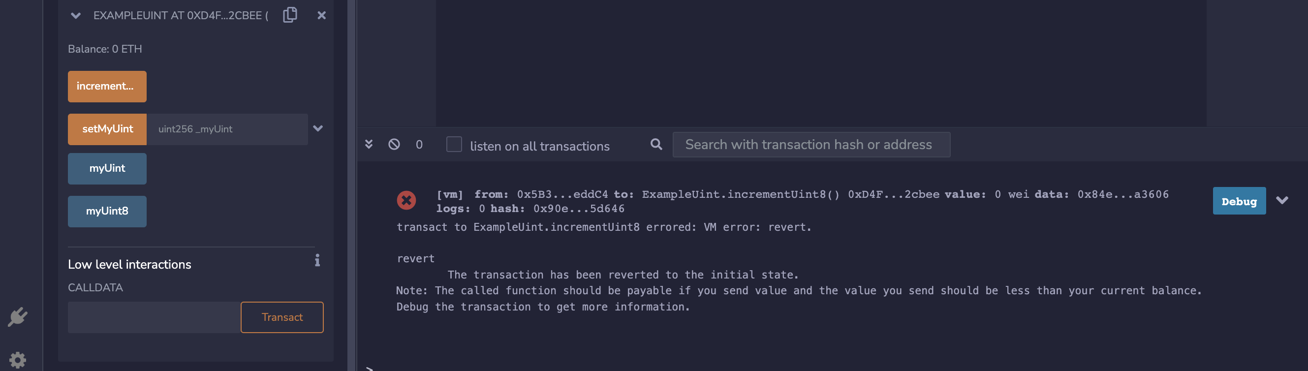 If we use uint8, however, and create a function to increment myUint by 1 and set the initial value to 250, after we increment five times we will get an error that it can only go to 255: