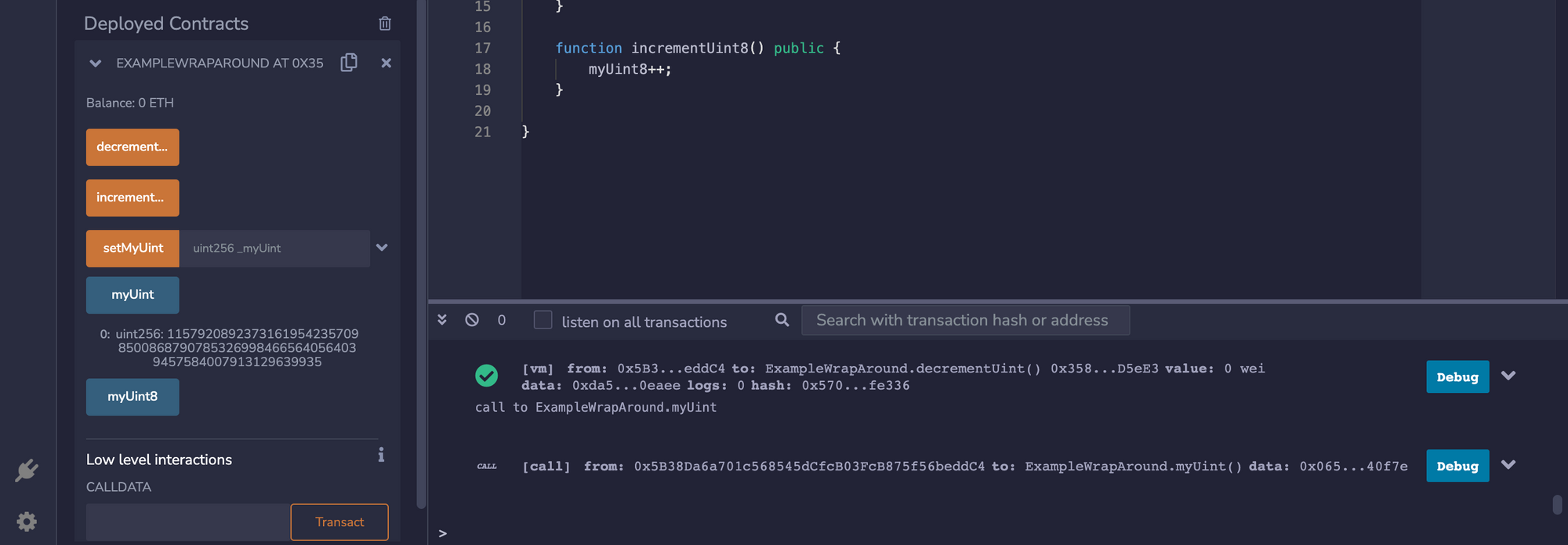 - Prior to Solidity version 0.80, arithmetic operations would always wrap in the case of an under of overflow.