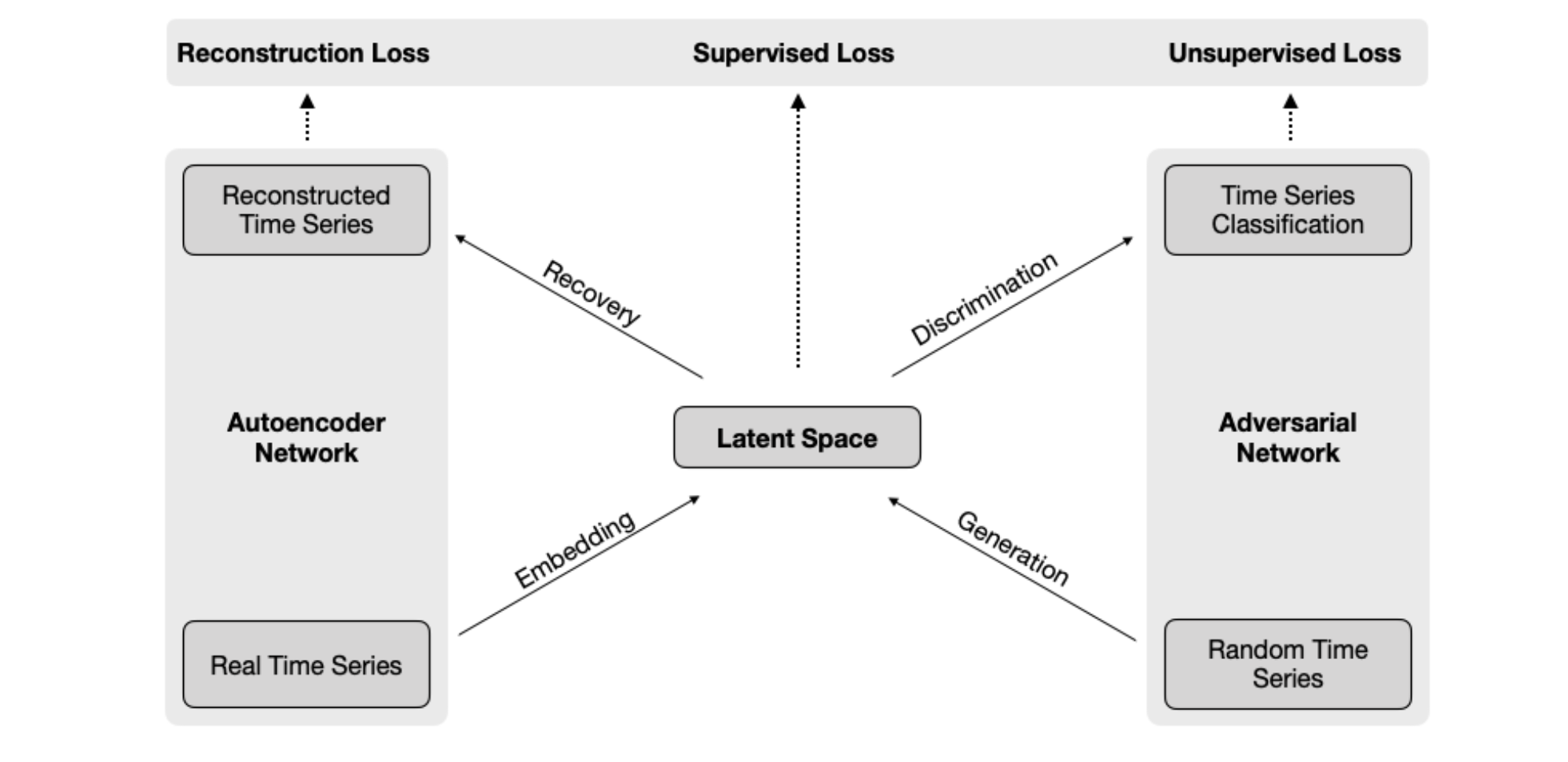 As mentioned, the TimeGAN architecture combines an adversarial network with an autoencoder and has the following four components: