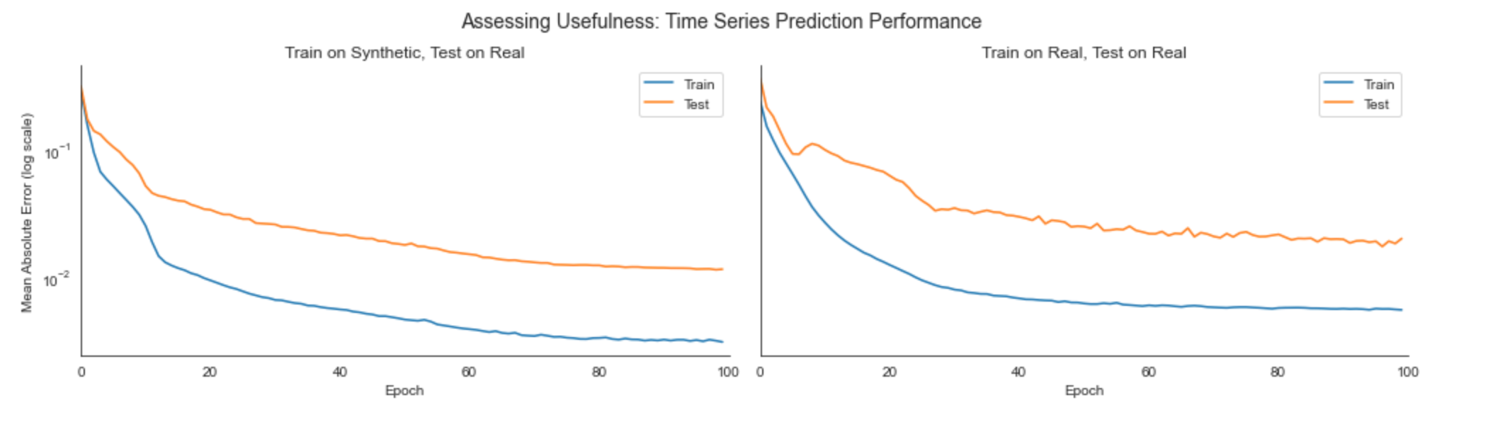 3. Usefulness: Finally, the synthetic data should be just as useful as the real data for solving predictive tasks. To evaluate this we can compare the test errors of a time series prediction model that is trained on either real or synthetic data:
