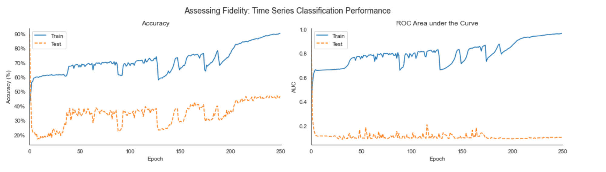 2. Fidelity: The sample series should be indistinguishable from the real data. To evaluate this, we use the test error (accuracy & ROC analysis) of a time-series classifier such as a 2-layer LSTM: