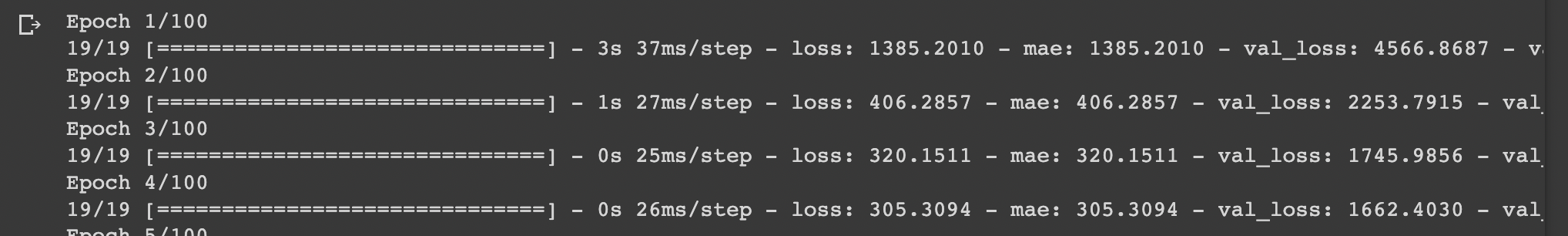 callbacks=[create_model_checkpoint(model_name=model_1.name)])For this model, we can see the MAE starts ~1386 and ends at ~178.