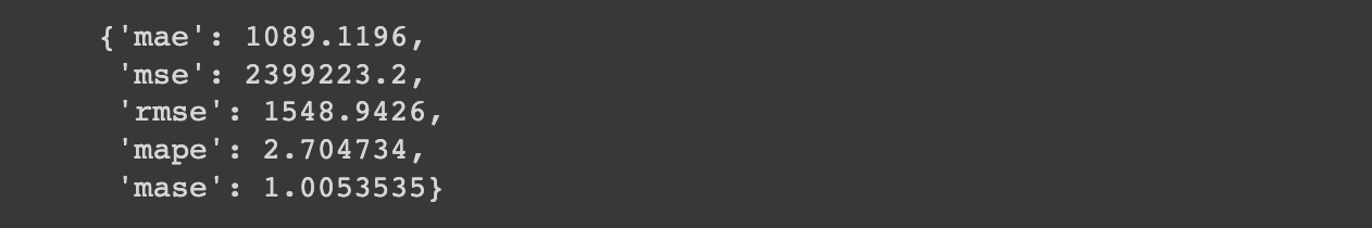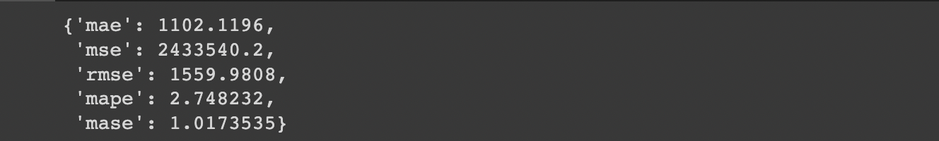 We can now evaluate these forecasts with our evaluate_preds() function: