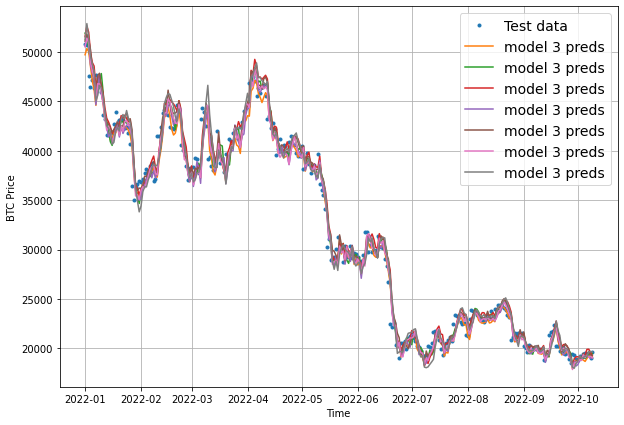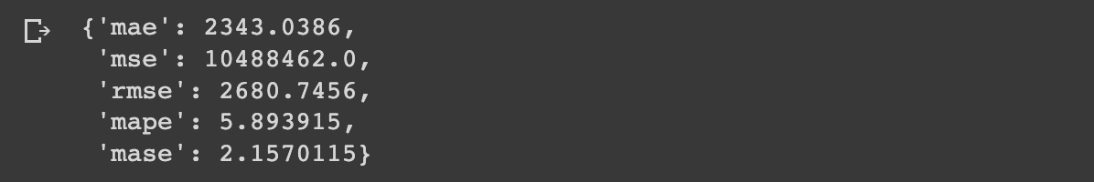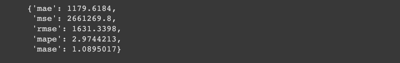 "mase": mase.numpy()}If we now run evaluate_preds on model 3 we get the following results: