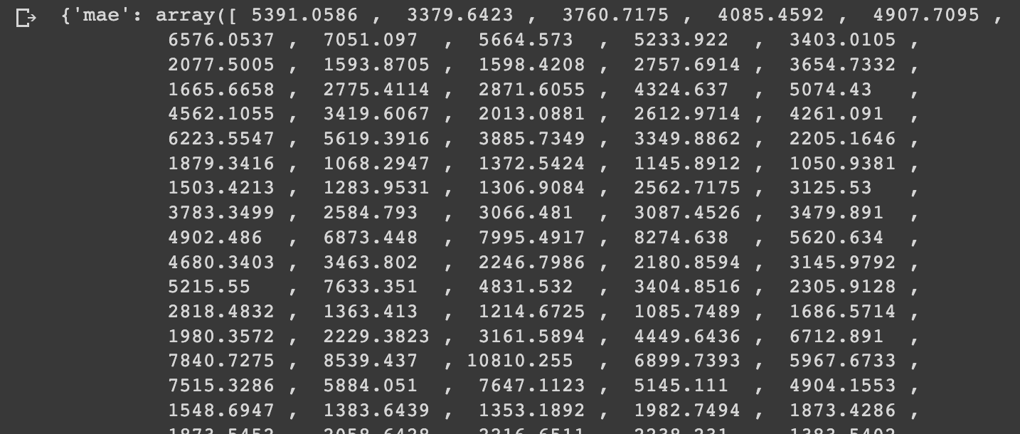 "mase": mase.numpy()}In order to update this to work with multiple dimensions, let's first look at the output of our evaluation metrics, such as MAE: