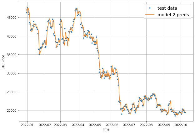 plot_time_series(timesteps=X_test[-len(test_windows):], values=model_2_preds, start=offset, format="-", label="model 2 preds")