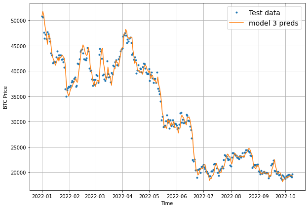 plot_time_series(timesteps=X_test[-len(test_windows):], values=tf.reduce_mean(model_3_preds, axis=1), start=offset, format="-", label="model 3 preds")