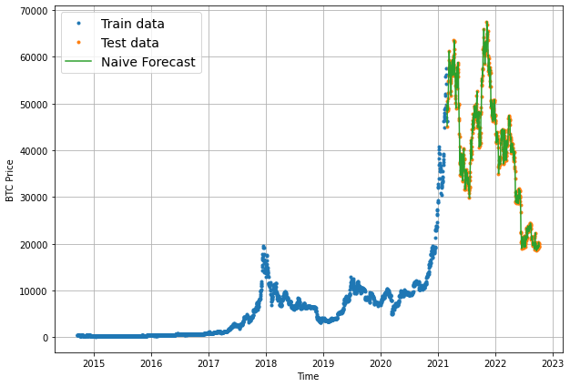 If we just look at the mae result, this is saying that the naive forecast on average was $1089 off from the true price of Bitcoin. Also, keep in mind that predictions on y_test only give us a hint of how our model might perform in the future since this data is still in the past.