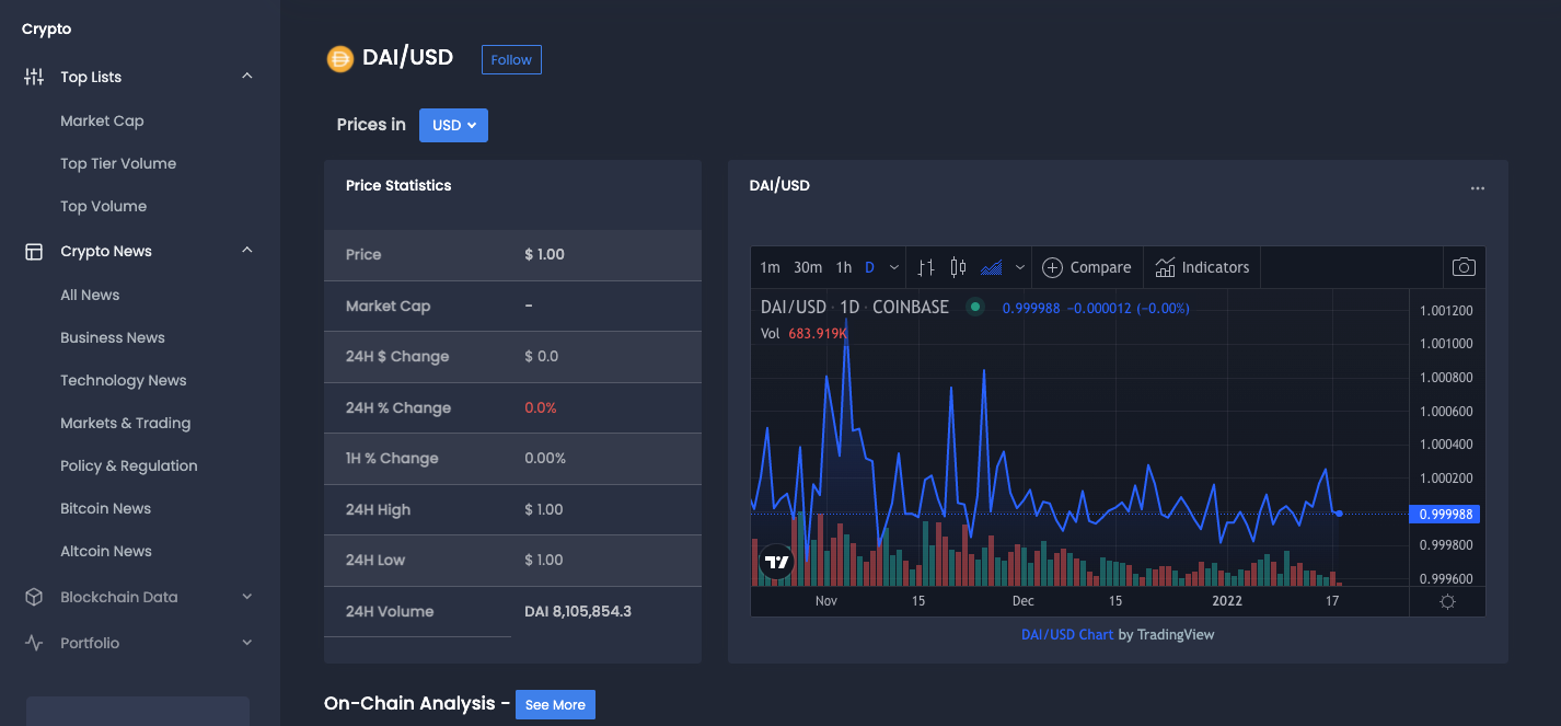 The first thing you will notice about Dai is that its native token, also called Dai, is almost always hovering around the $1.00 level. That is because Dai is a stablecoin that is pegged to the US Dollar, similar to Tether and USDC.